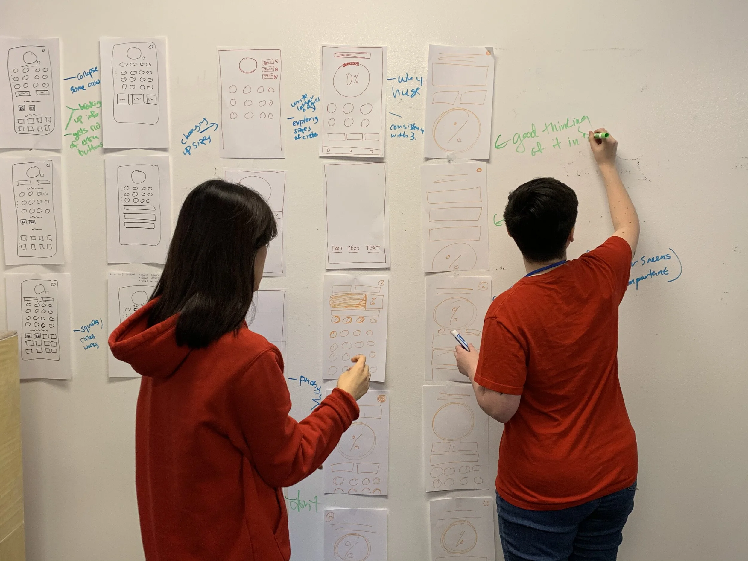 Result: Our interaction designer lead the brainstorming session, sketching various screens out, asking for our input, and clarifying any questions about the research findings. The result was a refined set of preliminary sketches taking a variety of our ideas into consideration.